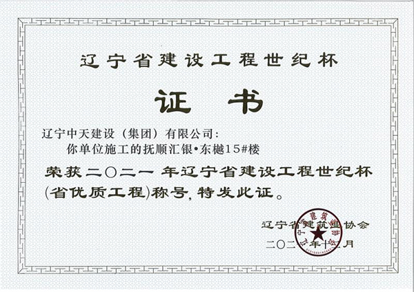 遼寧中天建設(shè)集團領(lǐng)導(dǎo)班子認(rèn)真貫徹落實科學(xué)發(fā)展觀,堅持以人為本,積極培育“開拓進取,求新向上,求真務(wù)實,團結(jié)奉獻”的企業(yè)精神和“干一項工程交一方朋友,占一方市場,樹一座豐碑”的經(jīng)營理念。經(jīng)過遼寧中天建設(shè)者的辛勤耕耘,許多建筑精品工程象一座座豐碑聳立在撫順大地上,令人矚目。撫順市保障性住房建設(shè)工程榮獲全國優(yōu)質(zhì)工程金獎,撫順移動通訊綜合樓、撫順市電信綜合樓、撫順市三寶屯污水處理廠擴建及中水回用工程等多項工程獲得“遼寧省世紀(jì)杯工程”、“遼寧市政金杯”工程等殊榮。公司還多次榮獲“省建筑業(yè)質(zhì)量管理先進施工企業(yè)”稱號。